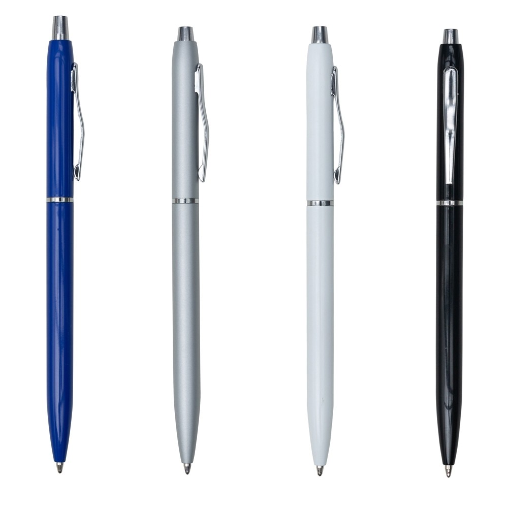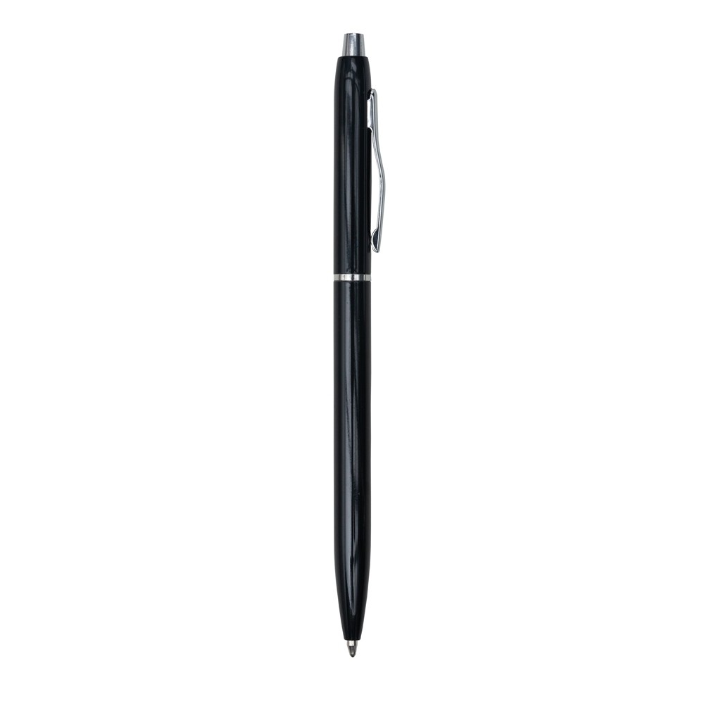 Caneta metálica com carga esferográfica azul e acionamento por clique. OBS.: PEDIDO APENAS MÚLTIPLO DE 100 PEÇAS!