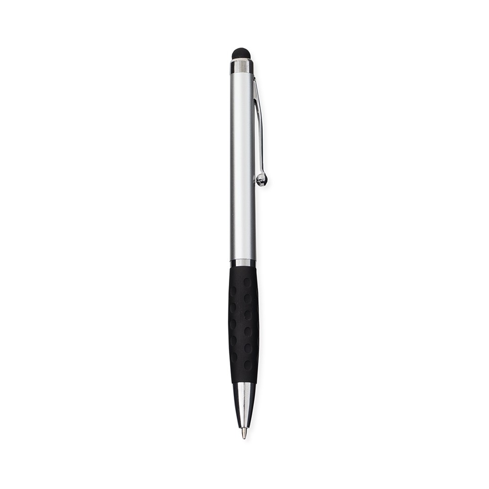 Caneta plástica com ponta, clip e pequenos detalhes em metal, além de detalhes ergonômicos na área próxima à tampa. Possui acionamento por rotação, carga esferográfica azul de 1.0mm e ponteira emborrachada para interação com dispositivos de telas sensíveis ao toque.