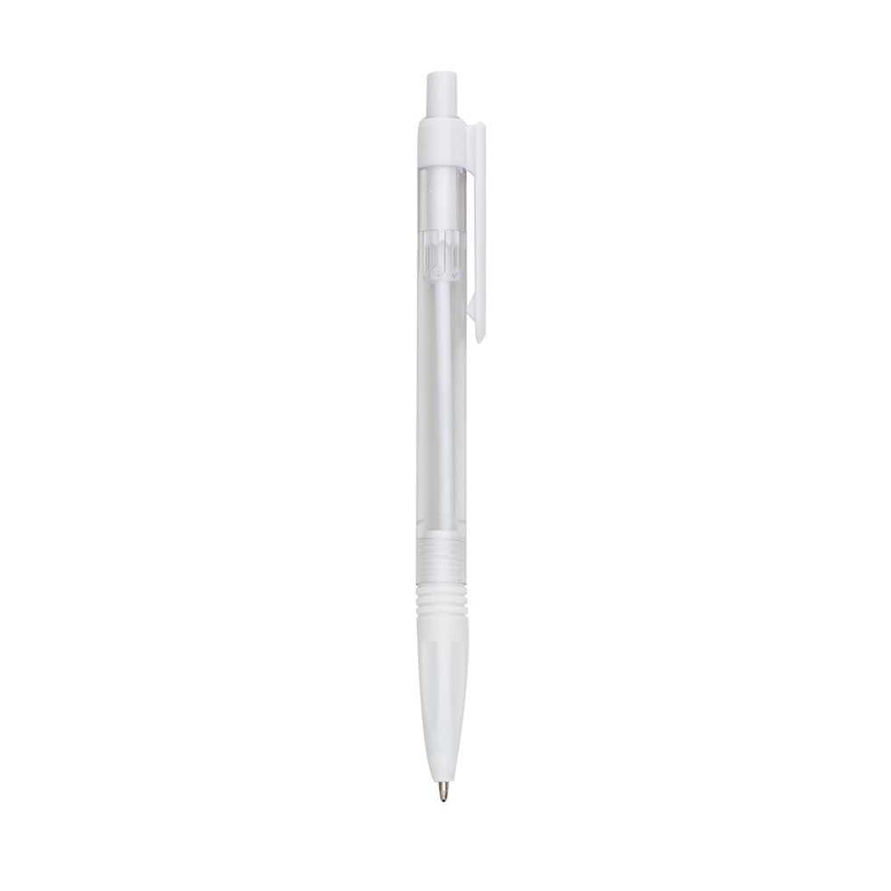 Caneta plástica com carga esferográfica azul 1.0 mm e acionamento por clique.