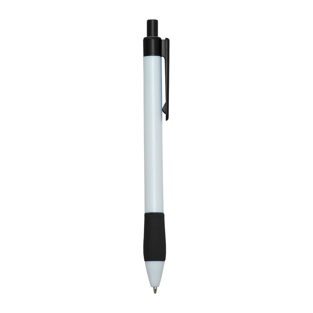 Caneta plástica com detalhe emborrachado, carga esferográfica azul 1.0 mm e acionamento por clique.