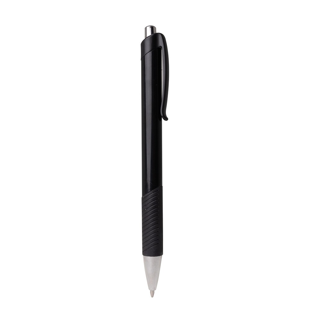 Caneta plástica com detalhe emborrachado, carga esferográfica azul 1.2 mm e acionamento por clique.