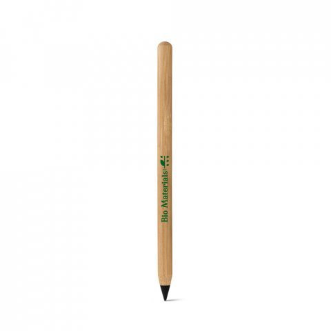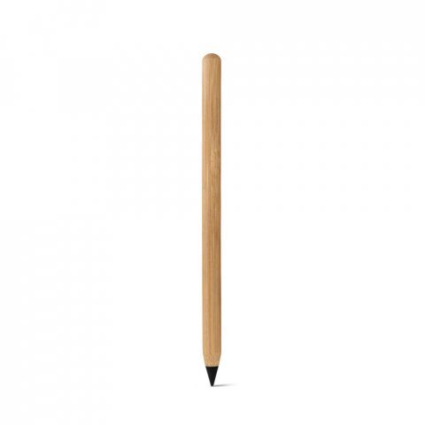 Caneta sem tinta em bambu com ponta de grafite, tampa protetora plástica. Apta para um uso prolongado sem a necessidade de apontar e a escrita pode ser apagada. A cor e o resultado da impressão nos materiais naturais pode variar entre produtos. Ø8 x 138 mm