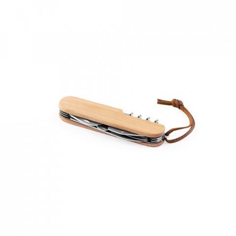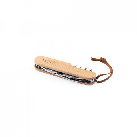 Canivete multifunções em bambu e aço inox com cordão em PU com 7 funções (S94366)