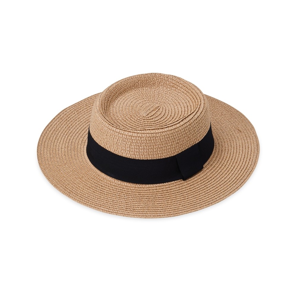 Chapéu de palha com aba levemente ondulada e faixa de poliéster fixa, feito em tamanho único com ajuste interno.
