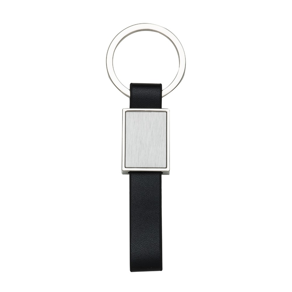 Chaveiro em metal de formato retangular com chapa frontal com bordas destacadas e verso inteiramente liso. Dispõe ainda de alça em couro sintético e argola de ferro niquelado, uma em cada extremidade. Especificações: - Altura  11,2 cm - Largura  3,2 cm - Espessura  0,7 cm - Medidas aproximadas para gravação(CxL)  2,4 cm x 1,7 cm - Peso aproximado(g)  22