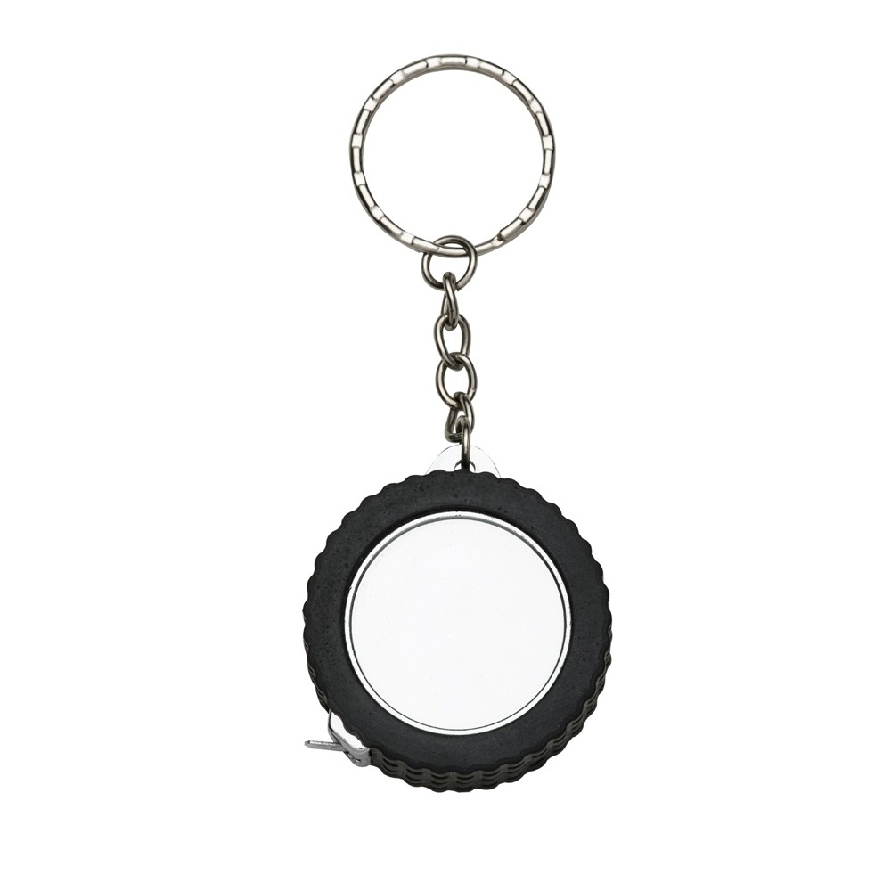 Chaveiro plástico em formato de pneu de carro e argola metálica. Possui uma trena com fita de alcance máximo de 1 metro, além de exibir suas medidas em pés e polegadas.