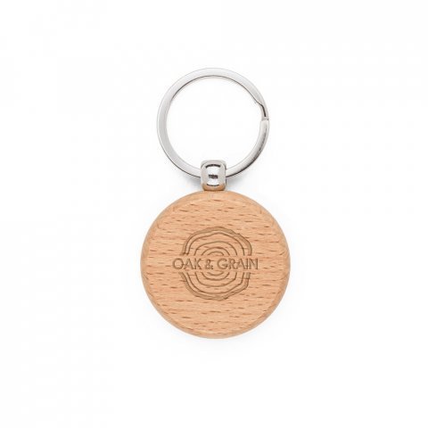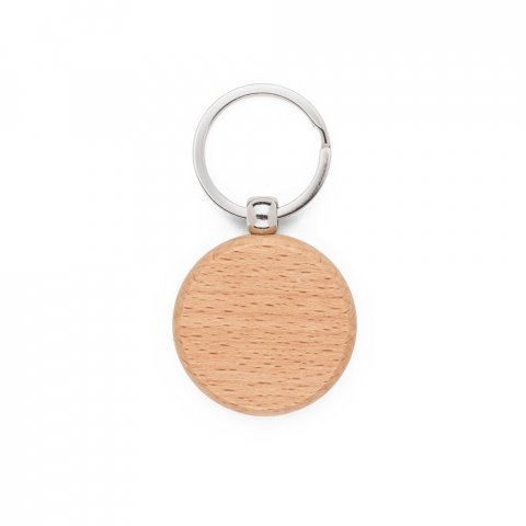 Chaveiro em madeira de faia, resistente e elegante. Possui uma argola em ferro para facilitar o transporte e arrumação. A cor e o resultado da impressão nos materiais naturais pode variar entre produtos. 40 x 77 mm | Chaveiro: ø40 mm | Argola: ø32 mm