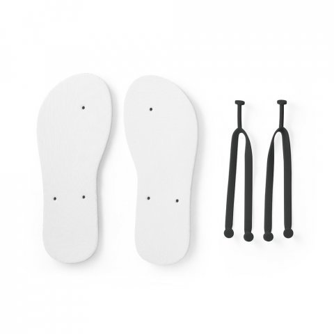 Chinelos confortáveis com sola em EVA e tira em PVC. A sola é totalmente personalizável em sublimação. Tamanhos disponíveis: G/GG (40 ao 43). Fornecidos num saco (montados em caso de personalização e desmontados em caso de não personalização). G/GG