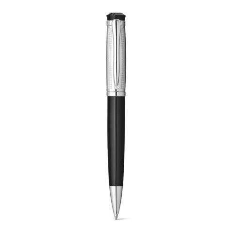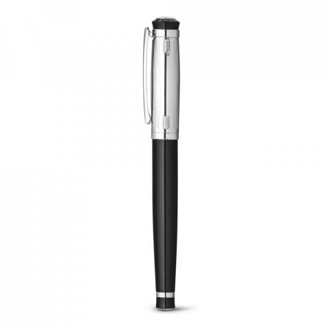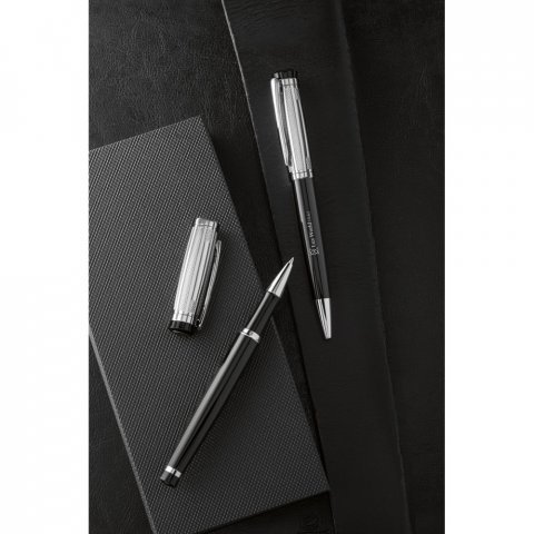 Conjunto de roller e esferográfica sofisticada, em ferro com acabamento brilhante preto e tampa cromada com clipe de ferro. Escrita em azul até 1,5 km. Fornecido em estojo presente almofadado. Esferográfica: ø13 x 136 mm | Roller: ø13 x 135 mm | Caixa: 192 x 34 x 85 mm
