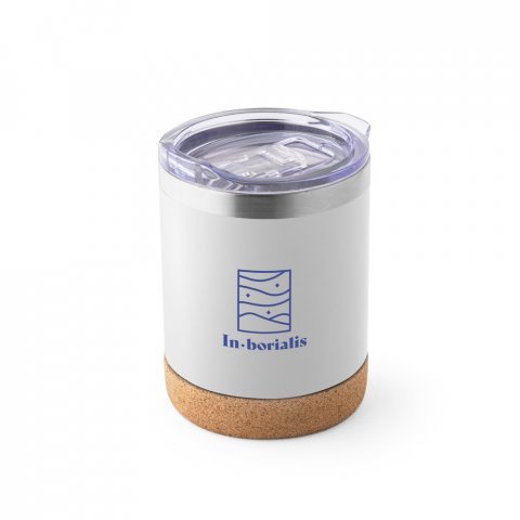 Copo de viagem em aço inox térmico, com parede dupla isolada a vácuo. Capacidade até 400 mL. Parede com acabamento fosco e base em cortiça. Contém uma tampa transparente com fecho deslizante. Fornecido em caixa presente de papel kraft reciclado. Certificação EU Food Grade Ø93 x 121 mm
