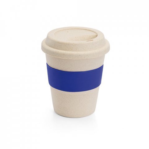 Copo de viagem em fibra de bambu (60%) e PP (40%) com tampa. Tira em silicone para facilitar o transporte de bebidas quentes. Capacidade até 380 mL Certificação EU Food Grade. ø95 x 114 mm