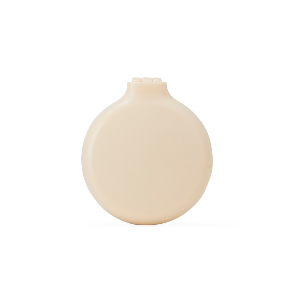Escova plástica com acabamento leitoso e espelho interno de vidro sem aumento. Possui cerdas retráteis macias que massageiam o couro cabeludo enquanto penteiam os fios de cabelos.