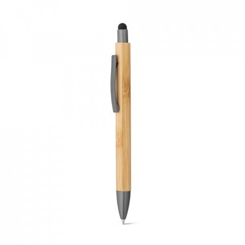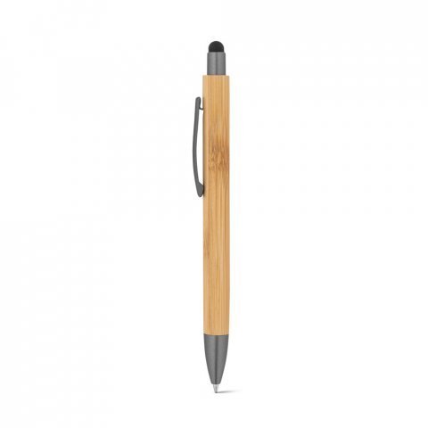Esferográfica em bambu com clipe em metal e acabamento mate. A esferográfica tem ponteira touch e escrita em preto até 1,5 km. A cor e o resultado da impressão nos materiais naturais pode variar entre produtos. Ø11 x 141 mm