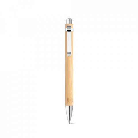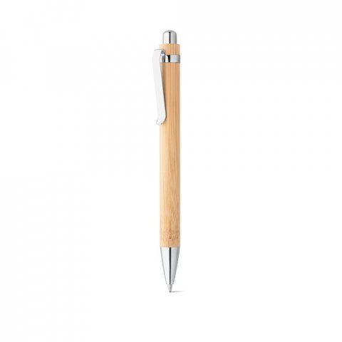 Esferográfica em bambu com clipe de metal. Escrita em azul até 1,5 km. A cor e o resultado da impressão nos materiais naturais pode variar entre produtos. ø11 x 138 mm