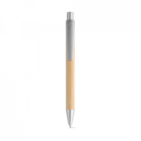 Esferográfica em bambu com clipe. Escrita em azul. Por ser um produto composto por materiais naturais, a cor e tamanho do produto e o resultado da impressão podem variar entre produtos. ø11 x 142 mm