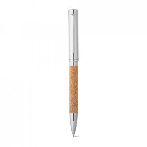 Esferográfica com corpo em cortiça e clipe em metal. Possui mecanismo twist e escrita em azul até 1,5 km. Fornecida numa bolsa presente de cortiça. A cor e o resultado da impressão nos materiais naturais pode variar entre produtos. Esferográfica: ø11 x 137 mm | Bolsa: 155 x 40 mm