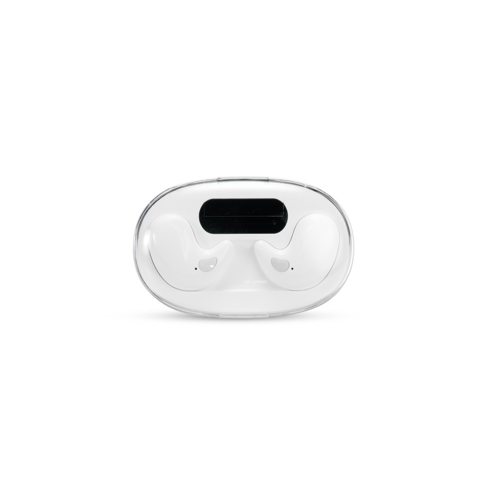 Fones de ouvido intra-auriculares sem fio, com estrutura leve e compacta em plástico e conexão via Bluetooth 5.3, garantindo estabilidade durante o uso. Possui estojo de carregamento com display de LED para visualizar o nível de carga. Acompanha cabo USB-C.