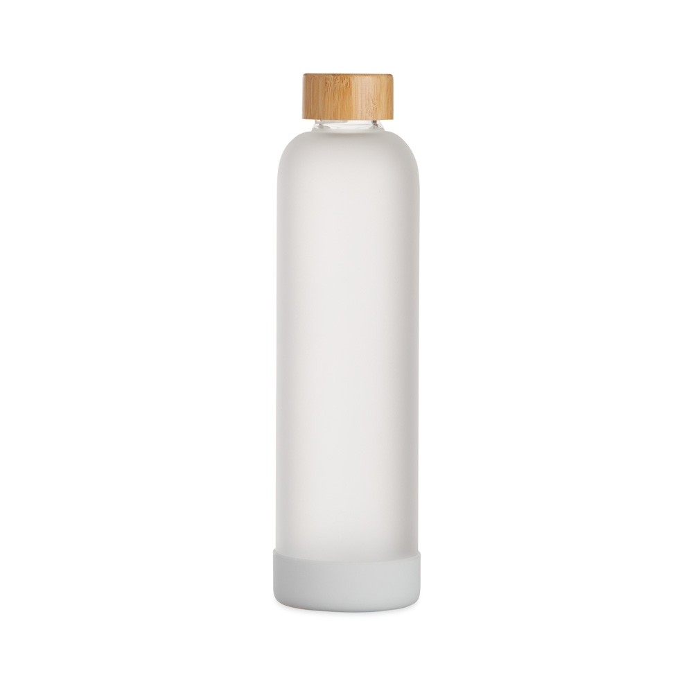 Garrafa em vidro borossilicato com capacidade de 1 litro. Conta com uma tampa rosqueável de bambu e protetor anti-impacto removível em silicone. Especificações: - Altura  30 cm - Largura  8 cm - Circunferência  24,6 cm - Medidas aproximadas para gravação(CxL)  22 cm x 8 cm - Tamanho total aproximado(CxL)  Diâmetro bocal 2,6 cm - Peso aproximado(g)  590