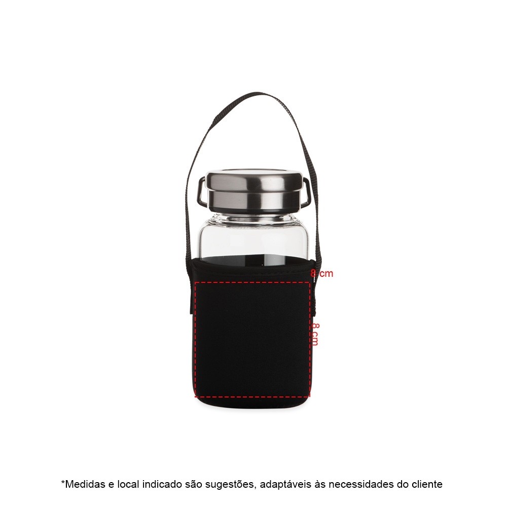 Garrafa de vidro borossilicato com capacidade de 650ml, acompanha peneira infusora e capa de neoprene com alça para transporte. Tampa de alumínio com alça para transporte.