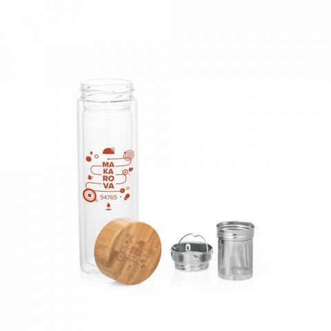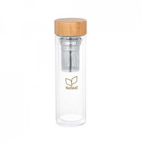 Garrafa em vidro borossilicato de parede dupla térmica, isolada a ar, com tampa em bambu e 2 infusores 490 mL Garrafa em vidro borossilicato de parede dupla térmica, isolada a ar, com tampa em bambu. Incluso 2 infusores em aço inox. Capacidade até 490 mL. Apto para ir a máquina de lavar, removendo a tampa. Preserva as bebidas quentes por 2 horas e as bebidas frias por 4 horas. Fornecido em caixa presente de papel kraft reciclado. Certificação EU Food Grade. A cor e o resultado da impressão nos materiais naturais pode variar entre produtos. ø72 x 234 mm