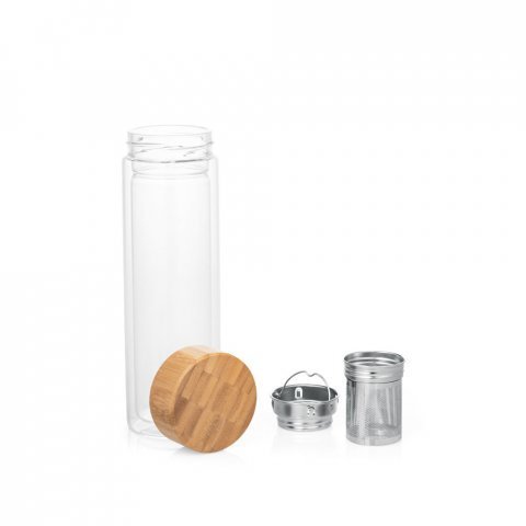 Garrafa em vidro borossilicato de parede dupla térmica, isolada a ar, com tampa em bambu e 2 infusores 490 mL (S94765)