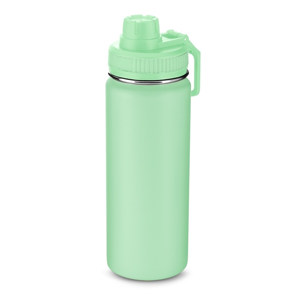 Garrafa em inox com capacidade de até 780ml. Tampa rosqueável, alça de plástico e anel de silicone para vedação. Pintura eletrostática.