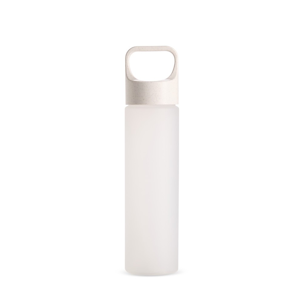 Garrafa plástica com capacidade para até 650ml. Possui tampa rosqueável em fibra de arroz com alça para transporte.