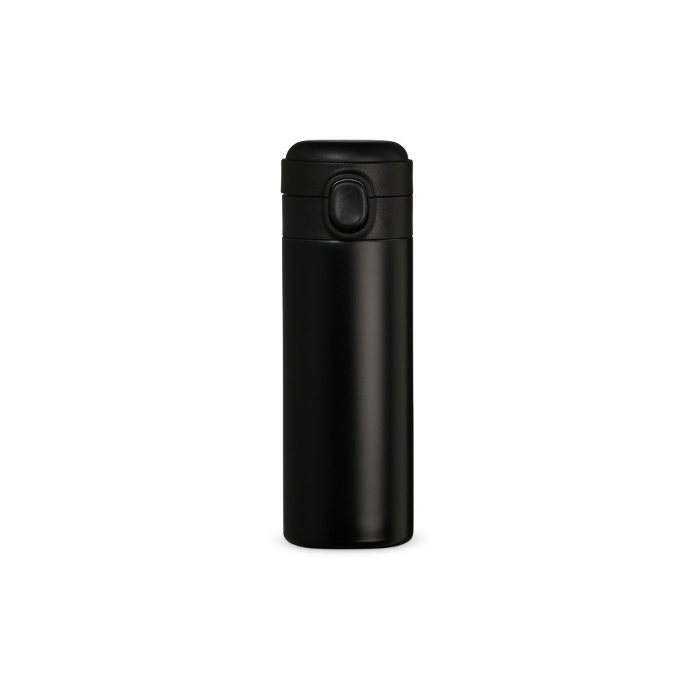 Garrafa térmica em inox com parede dupla, capacidade de 400ml. Tampa com botão central para abertura e borracha interna para vedação.