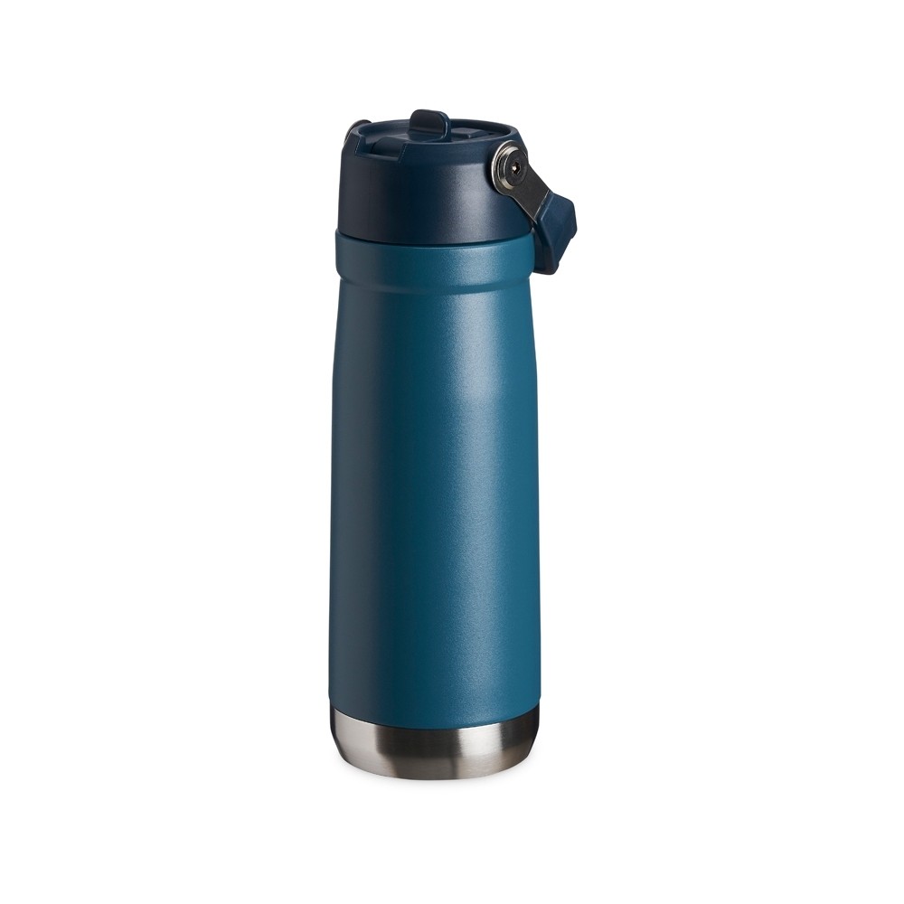 Garrafa térmica em inox de parede dupla, capacidade de 700ml. Tampa com alça de transporte, bico flip e canudo interno.