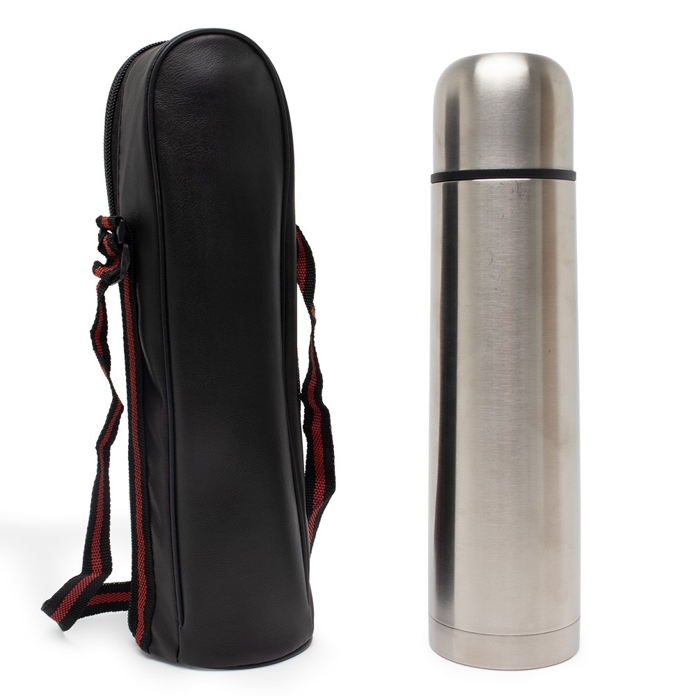 Garrafa térmica feita em inox parede dupla com capacidade de 750ml, acompanha capa de couro sintético com alça de nylon.