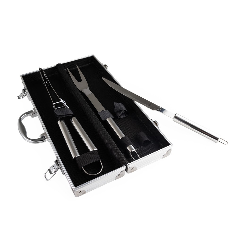 Kit de churrasco com três peças em aço inox. O conjunto inclui uma pinça, um garfo e uma faca de seis polegadas. Acompanha maleta de alumínio com placa para personalização.