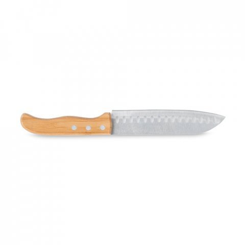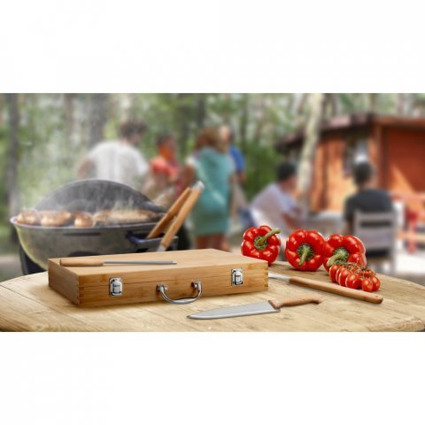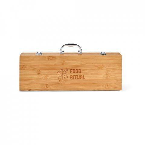 Kit churrasco em estojo de bambu. Composto por 6 peças em aço inox e bambu: faca chefe, faca média, faca japonesa, pinça, garfo e afiador. Certificação EU Food Grade. A cor e o resultado da impressão nos materiais naturais pode variar entre produtos. Estojo: 455 x 160 x 65 mm