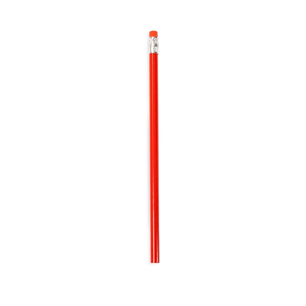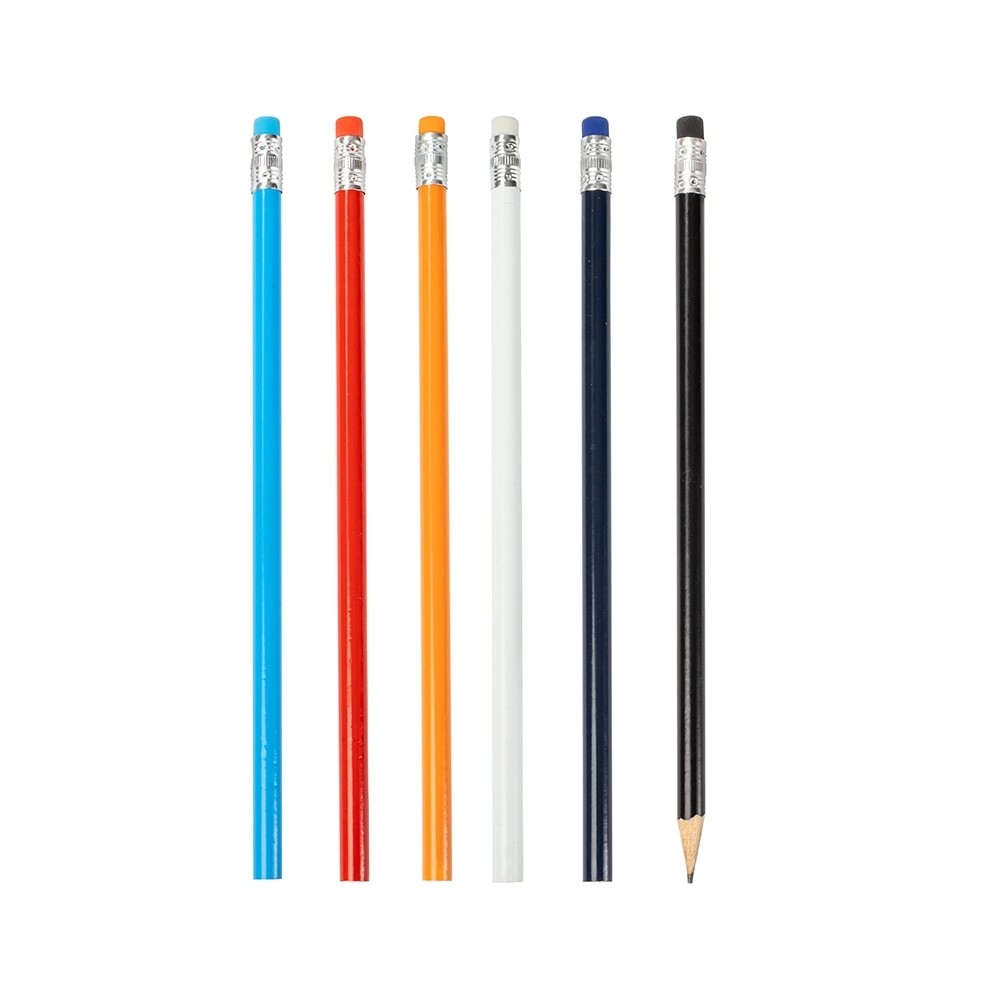 Lápis sem ponta feito em madeira com grafite preto HB, guarnição em metal e borracha na extremidade oposta.
