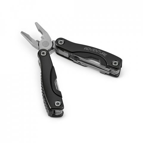 Mini alicate multifunções dobrável em aço inox e alumínio. Incluso 9 funções: alicate, lâmina de serra, 2 abridores, parafuso com a cabeça cruzada, faca, chave de fendas de cabeça plana (grande e pequena) e lima de unhas. Fornecido em bolsa de 600D. Fechado: 35 x 70 x 18 mm | Bolsa: 50 x 90 x 20 mm