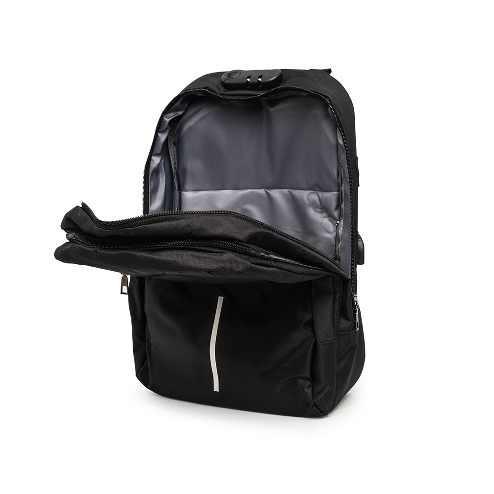 Mochila antifurto com cadeado de segredo. Produzido em poliéster, tem a parte frontal à prova d’água (respingos). Compartimento principal com bolso para notebook 15,6 e divisórias, bolso de tela, parte externa com cadeado de segredo para trava dos zíperes; e bolso frontal. Possui entrada para fone de ouvido, suporte com entrada USB na parte externa e cabo USB acoplado internamente; permitindo a conexão de um carregador portátil na área interna e a conexão de um eletrônico na área externa, viabilizando a carga e utilização do eletrônico enquanto caminha. Alças para as costas ajustáveis revestidas com espuma, alça para mãos em alumínio e alça para encaixe em malas de viagem. Utilização do cadeado: para criar um segredo, pressione e segure o botão, crie a numeração desejada e em seguida solte o botão para assumir a codificação criada. Repita o mesmo processo sempre que necessitar fazer alguma alteração.