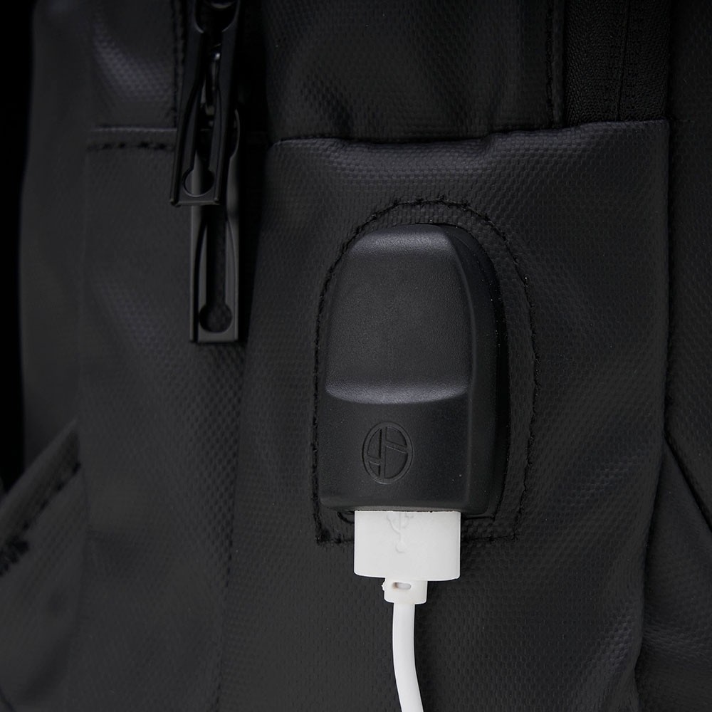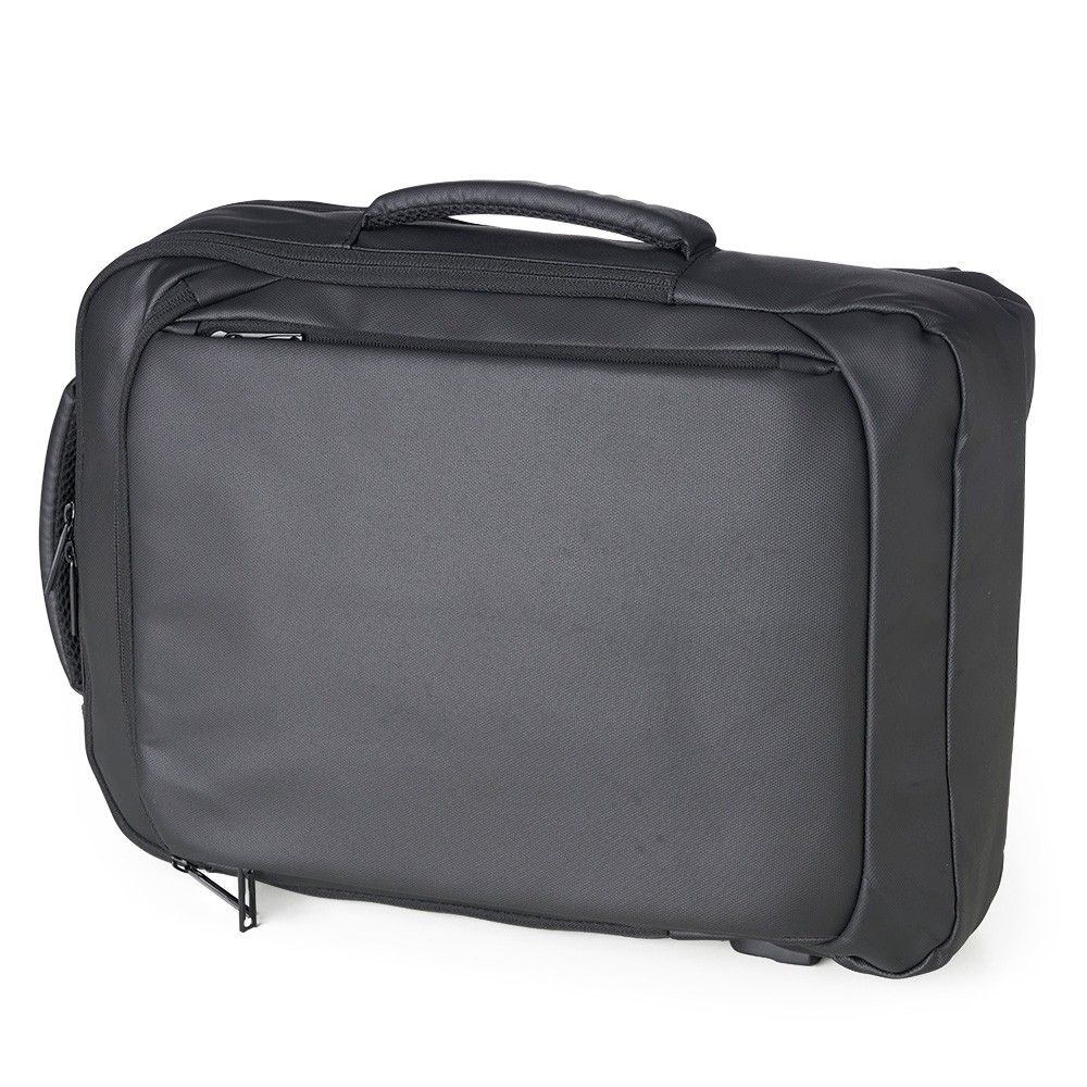 Mochila em couro sintético 22 litros resistente à água com cinco compartimentos, sendo o principal com bolso para notebook 15,6. Com divisórias internas para acessórios, a mochila possui suporte externo usb, alça para encaixe em malas de viagem e duas alças de mãos, sendo uma delas lateral para o transporte da mochila no modo pasta.