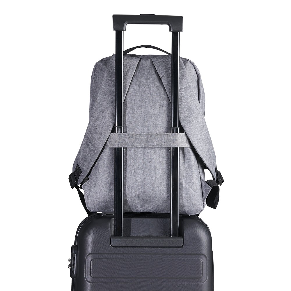 Mochila de nylon 18 litros com três compartimentos, sendo o principal com bolso para notebook 15,6. Com divisórias internas para acessórios, a mochila possui bolso lateral, suporte externo usb e alça para encaixe em malas de viagem.