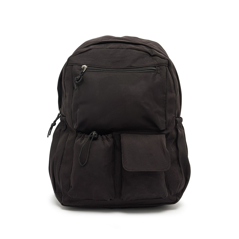 Mochila de poliéster de 24 litros com dois compartimentos, sendo o principal com um bolso raso para notebook de até 15,6 polegadas. A mochila possui um adaptador USB externo e quatro bolsos: dois laterais com elástico, um com velcro e um com cordão ajustável.