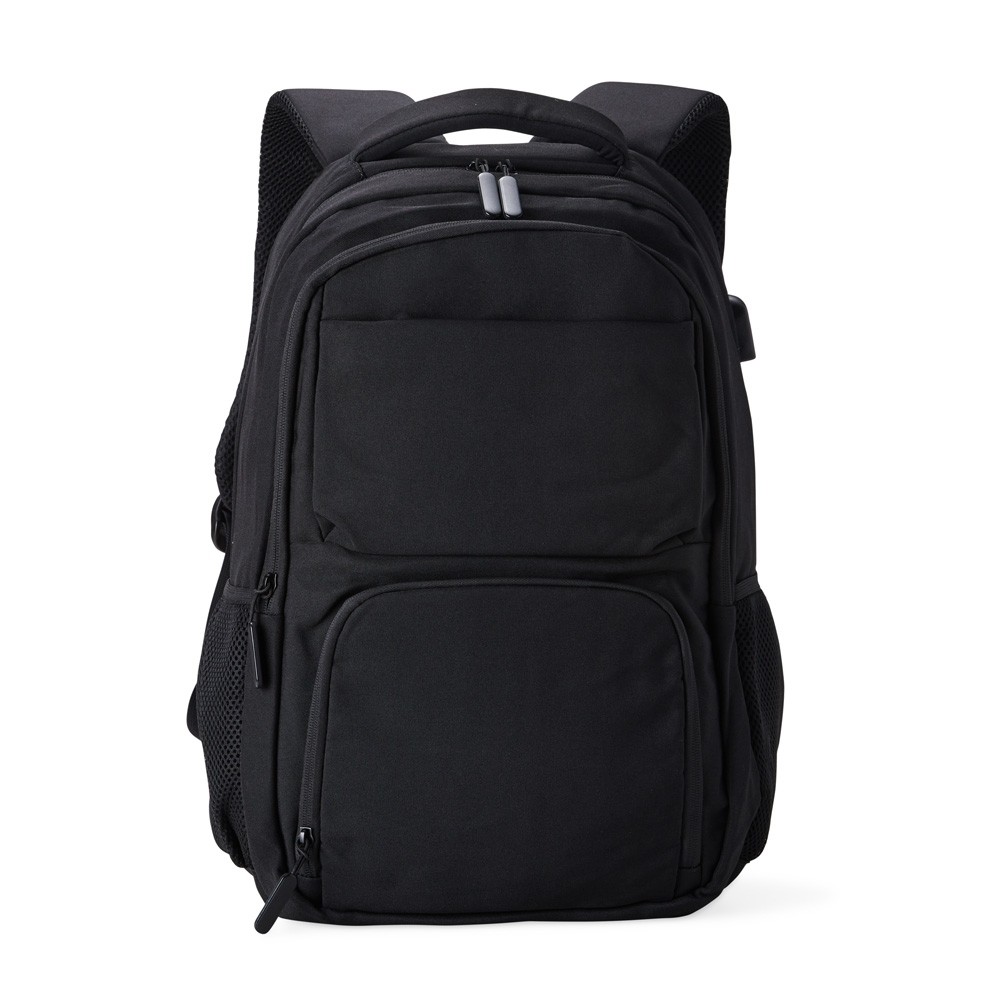 Mochila de poliéster 28 litros com seis compartimentos, sendo o principal com bolso para notebook 15,6 e tablet 12,4. Com divisórias internas para acessórios e porta chave, a mochila possui adaptador USB externo, bolsos laterais telados, duas alças de mãos, área costada e alças para as costas com revestimento espumado.