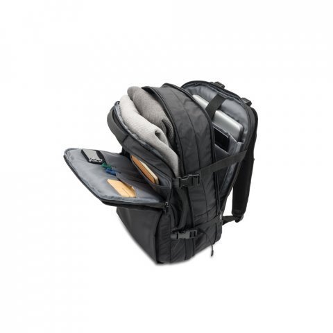 Mochila de viagem em poliéster reciclado 600D de alta densidade, com bolso para notebook 17.3" e placa para gravação 29 L Mochila de viagem em poliéster reciclado (rPET) 600D de alta densidade, com acabamento repelente à água. Composta por 3 compartimentos principais com forro em poliéster reciclado (rPET) 210D: compartimento traseiro com bolso para notebook até 17.3" e bolso para tablet até 10.1", compartimento central expansível com zíper destinado à arrumação de roupa e um compartimento frontal com vários bolsos interiores. Possui ainda três bolsos frontais, dois deles com forro em PEVA com dimensões distintas, ideais para colocar o seu squeeze, roupa molhada ou cosméticos. Além destas características, reúne ainda outros diferenciais como: placa metálica removível com ímã para fácil gravação, alças de ajuste que tornam esta mochila mais confortável, cintas de compressão nas laterais, pegas superiores e laterais almofadadas. A parte posterior incorpora uma alça para trolley em caso de necessidade. Capacidade até 29 L. Expandida: 320 x 460 x 200 mm | Compacta: 320 x 460 x 110 mm