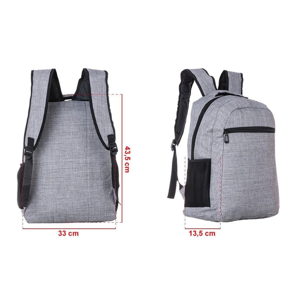Mochila confeccionada em poliéster com compartimento para notebook até 15,6 polegadas. Contém um compartimento grande, compartimento frontal e bolsos laterais em malha. Alça de mão com revestimento espumado e alças para as costas ajustáveis.