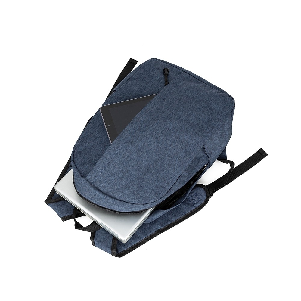 Mochila em poliéster com compartimento para notebook até 14 polegadas. Contém um compartimento grande, compartimento frontal e bolsos laterais. Alça de mão em nylon e alças para as costas ajustáveis.