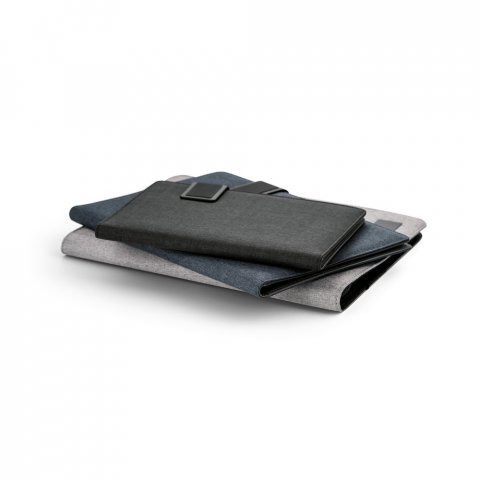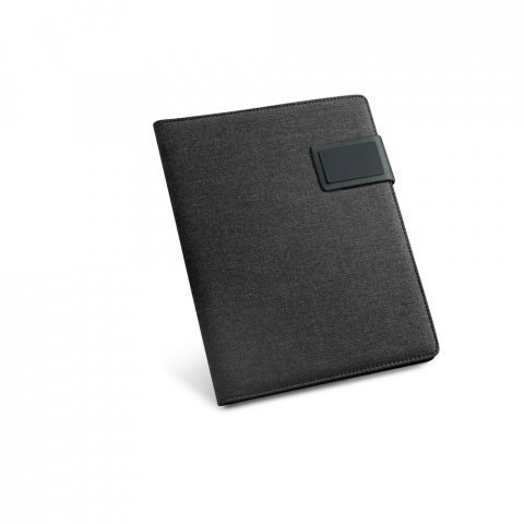 Pasta A5 em linho sintético e c. sintético com fecho magnético. O interior contém um bloco de 40 páginas pautadas, suporte para esferográfica (não inclusa) e outros compartimentos para acessórios (não inclusos). 183 x 252 x 18 mm | Placa: 50 x 30 mm