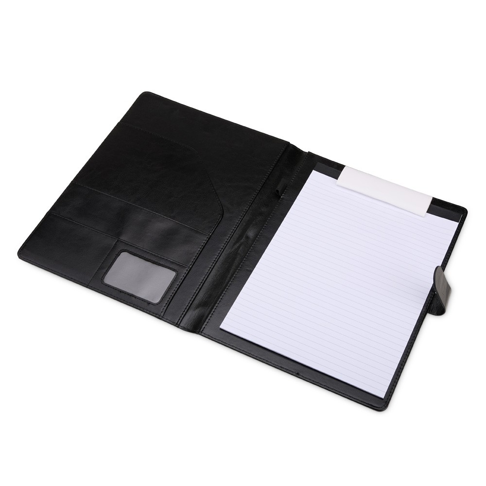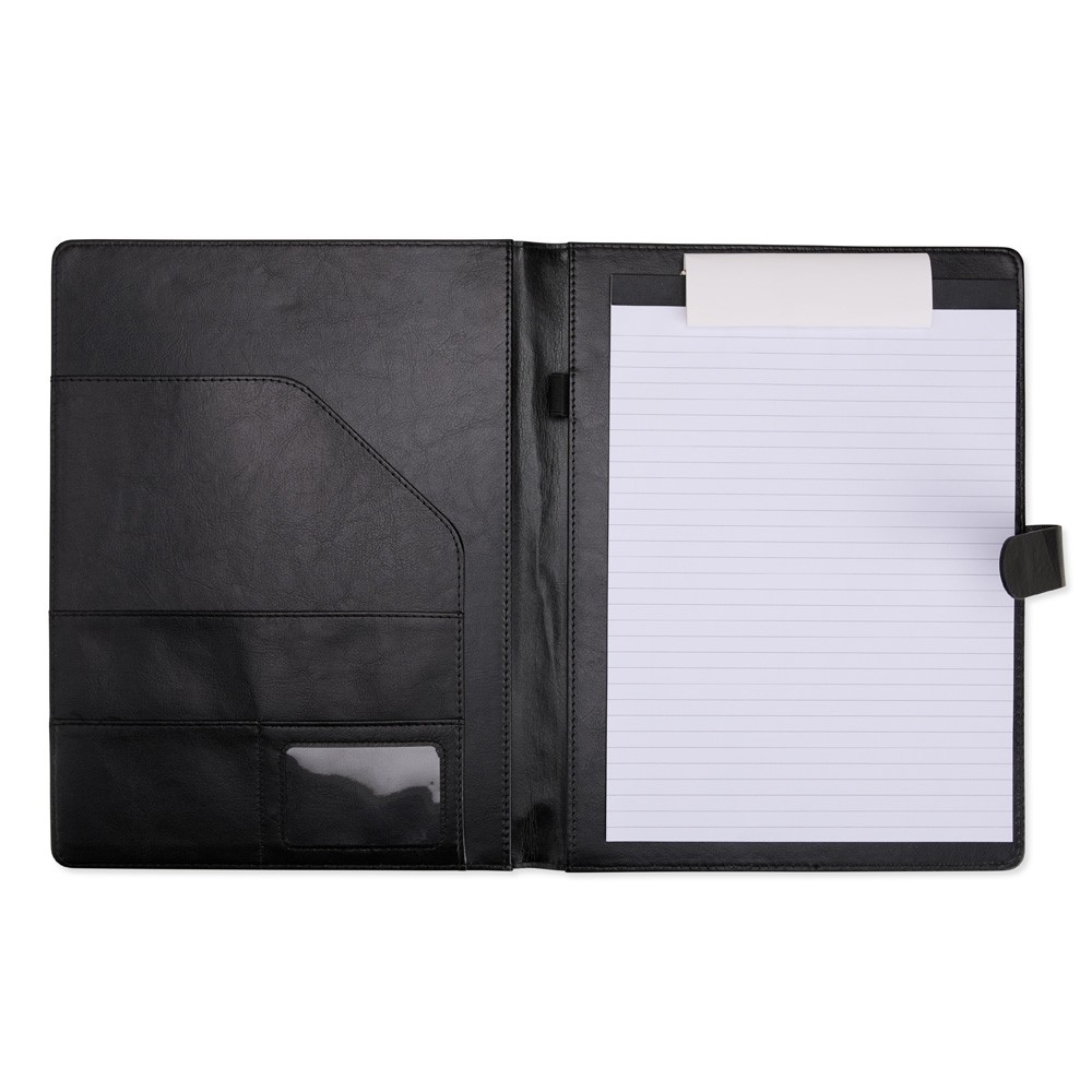 Organização impecável com estilo profissional. Nossa pasta executiva, feita em couro sintético de alta qualidade, acompanha um bloco de aproximadamente 20 folhas pautadas removíveis para anotações, suporte para caneta, bolsos para organizar folhas ou documentos, suporte para cartões, incluindo um com visor de identificação. Além disso, possui fechamento magnético, unindo praticidade e elegância em um único produto.