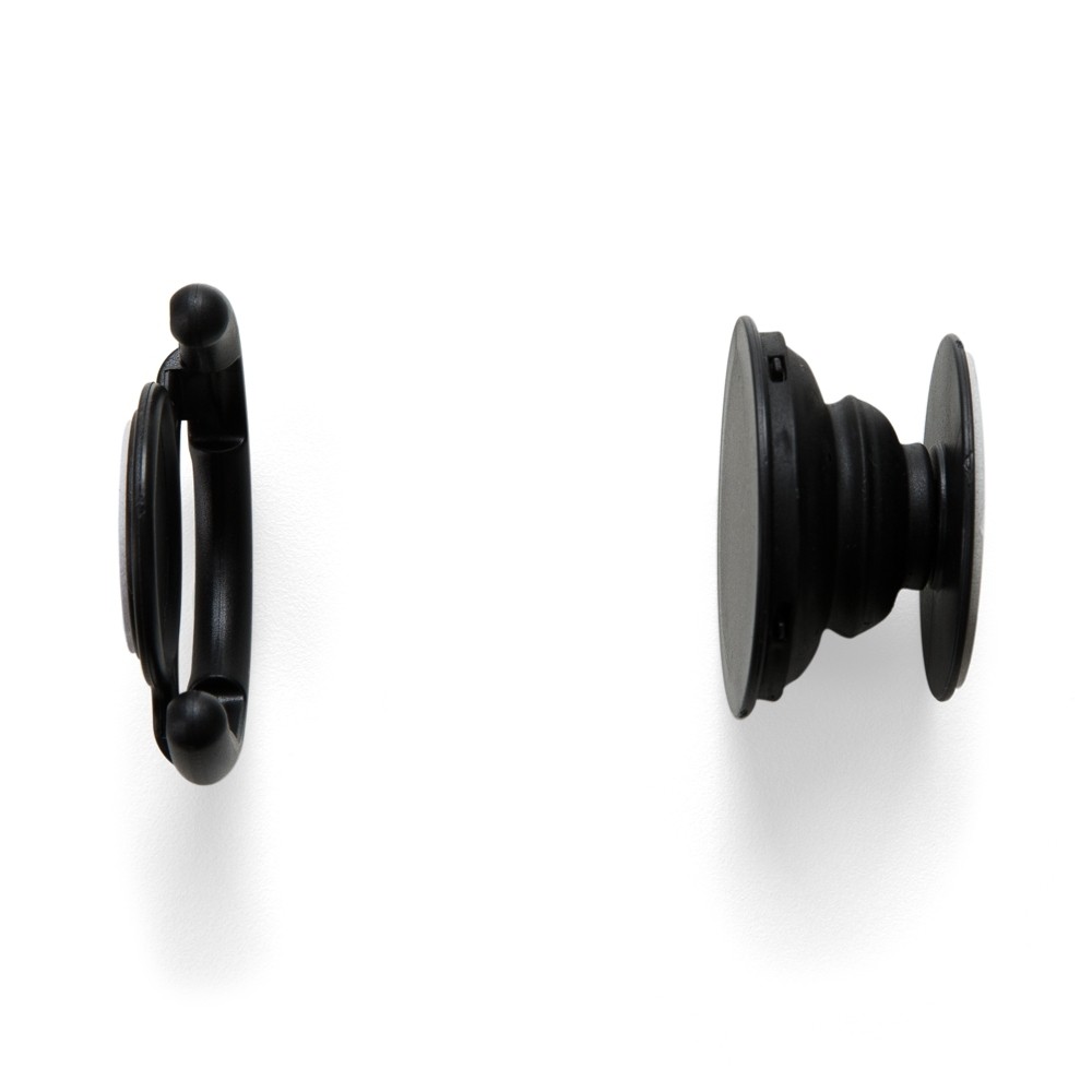 Suporte plástico para celular. Material plástico colorido, possui “disco” anelar retrátil que ao puxá-lo abrirá o encaixe para os dedos e possibilitará a rotação da peça. Base plástica para encaixe, pode ser colada no celular, paredes, vidros, ou onde desejar afim de que possa encaixar o suporte anelar. Suporte e base com adesivos, basta remover a proteção e colar no local desejado.