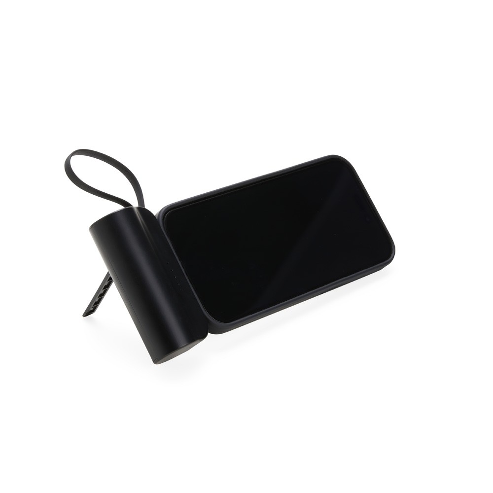 Power bank 5.000mAh plástico com indicadores de bateria em LED, contém haste de suporte para celulares com a entrada Lightning e cabo tipo-C acoplado. Acompanha cabo USB Tipo-C. Especificações: - Altura  4,6 cm - Comprimento  8 cm - Espessura  2,7 cm - Medidas aproximadas para gravação(CxL)  0,5 cm x 7 cm - Peso aproximado(g)  115