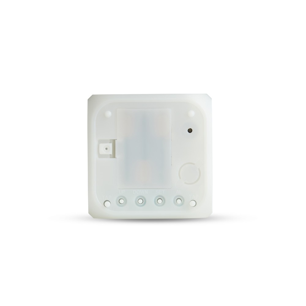 Relógio digital em plástico com iluminação LED e painel LCD multifuncional, que exibe horas, dias da semana, data e temperatura ambiente. Possui painel de botões para controle das funções do aparelho, além de função de alarme com nove opções de toques e modo soneca. Funciona com três pilhas AAA (não inclusas). Especificações: - Altura  7,8 cm - Largura  7,8 cm - Profundidade  7,8 cm - Medidas aproximadas para gravação(CxL)  6,5 cm x 6,5 cm - Peso aproximado(g)  87
