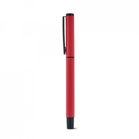 Roller em alumínio com clipe de metal e acabamento emborrachado. Escrita em preto. ø10 x 136 mm