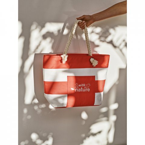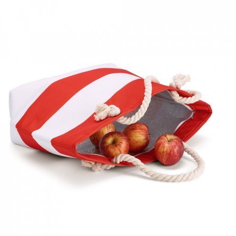 Sacola térmica em 600D poliéster reciclado 16 L Sacola térmica em poliéster reciclado 600D e alça em algodão com 65 cm. Contém um bolso principal com isolamento e 1 bolso frontal. Capacidade até 16 L. Certificação EU Food Grade. 500 x 360 x 145 mm