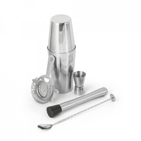 Set de coquetel com 6 peças em aço inox: um shaker (600 + 450 mL), um copo dosador (30 mL), uma colher, um pilão e um coador. Inclusa uma bolsa em non-woven. Fornecido em caixa presente. Certificação EU Food Grade. Caixa: 98 x 98 x 290 mm